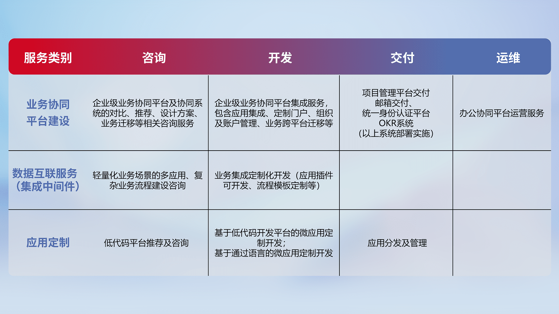 针对钉钉、、、企微、、、IDaas等平台级产品提供产品的规划、、、方案、、、、交付、、定制化开发等服务,,,实现如统一协同办公、、、、智能客户服务、、、混合会议管理、、智能数据查询、、、、等业务场景,,实现数字化转型。。。