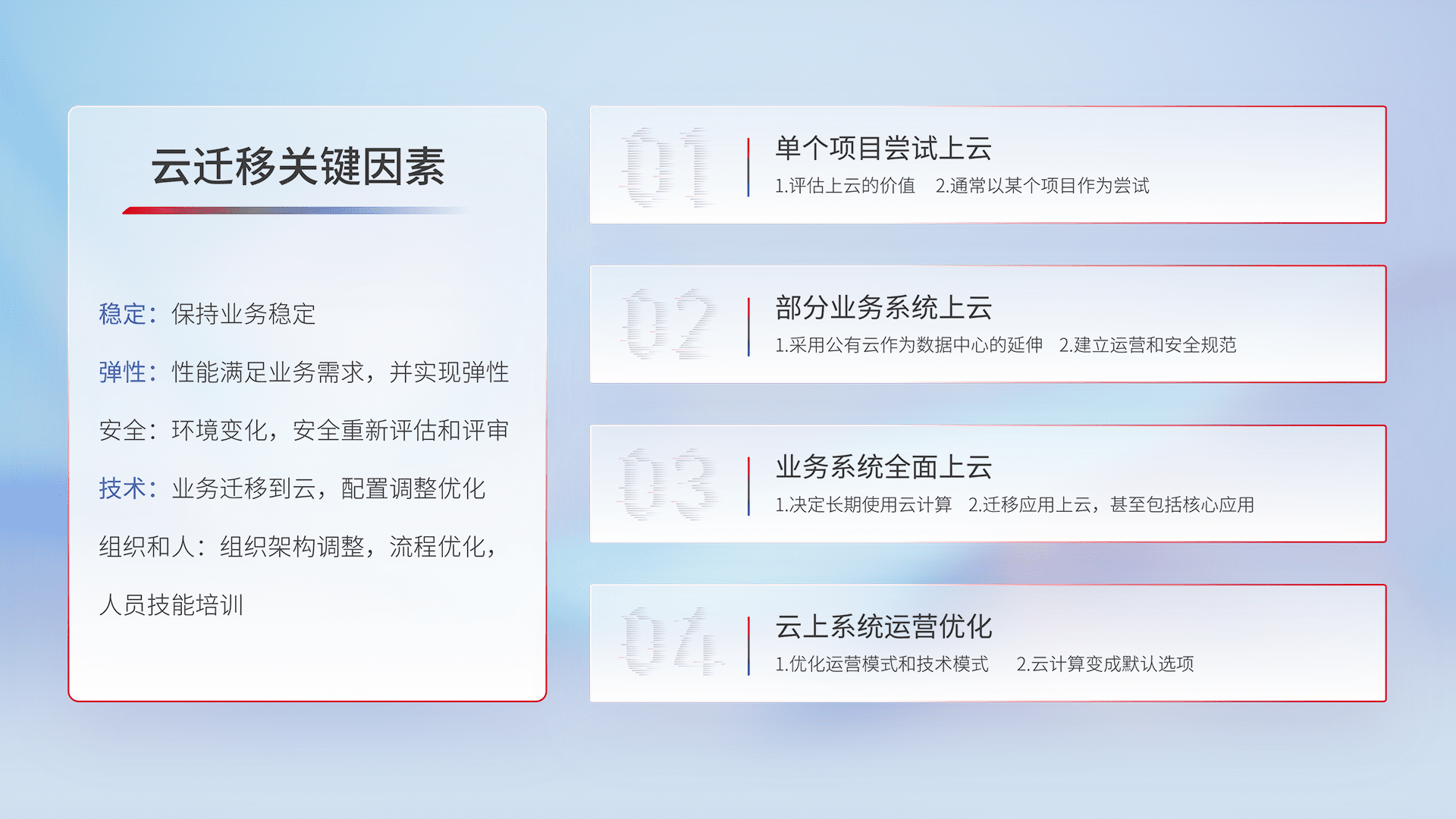结合实际业务,,,从规划设计、、、云平台选型、、、、云原生改造、、数据迁移、、、集成交付,,,迁移全过程为客户识别最佳上云路径,,做好风险识别管理,,,,设计网络架构、、、身份权限、、、、安全审计合规、、、操作审计、、日志审计、、监控告警策略、、多站点容灾设计等,,对云上基础设施进行整体规划,,,,提升IT治理水平,,,以满足弹性、、高可用、、高性能的需求。。。