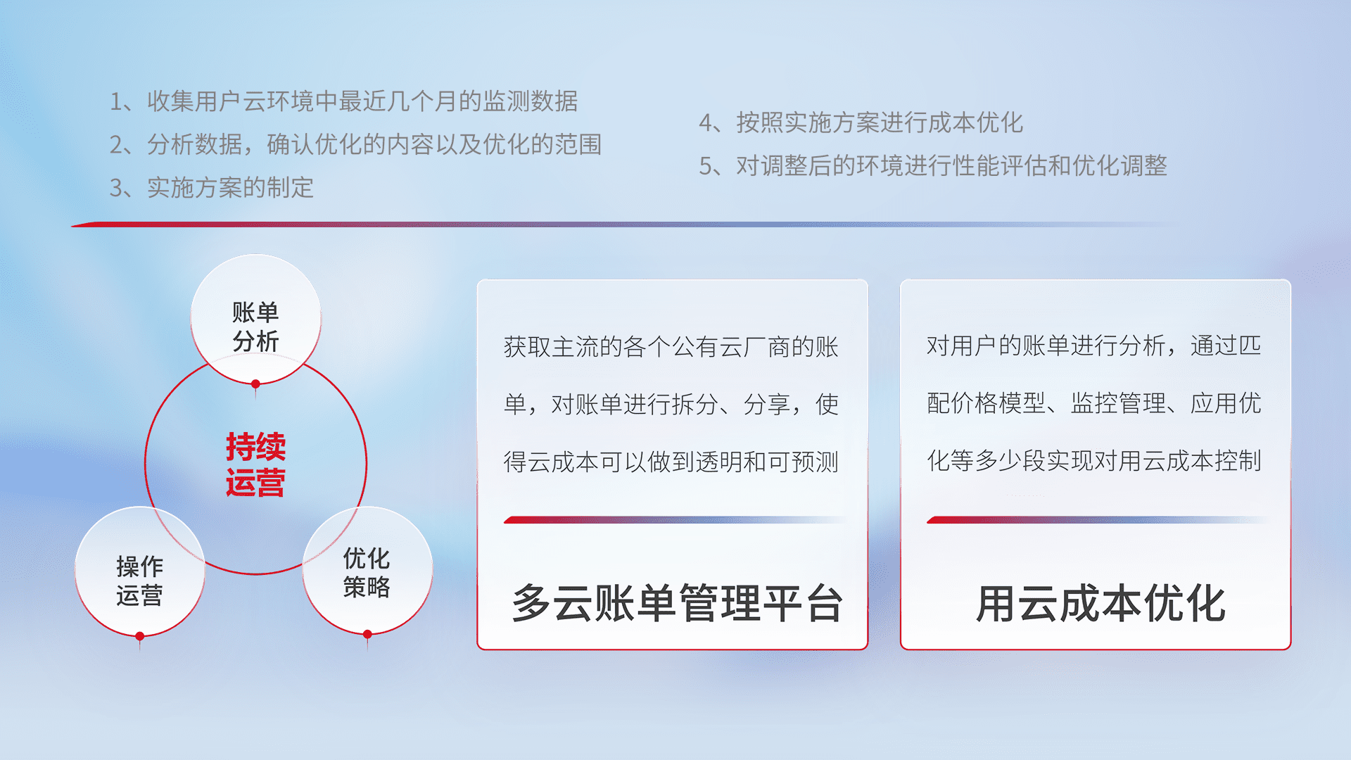 通过多云纳管,,,以统一的资源数据模型把客户的云资源进行抽象和封装,,,进而实现对多云资源的统一操作,,保障云资源管理的可靠性、、稳定性与可用性。。量身定制化运维内容,,配置、、、开发运维、、、补丁管理、、、、备份、、、、监控、、、、认证和访问管理、、审计和日常巡检等,,,,保障在用云过程中的可靠度,,,,稳定度以及高可用率。。
